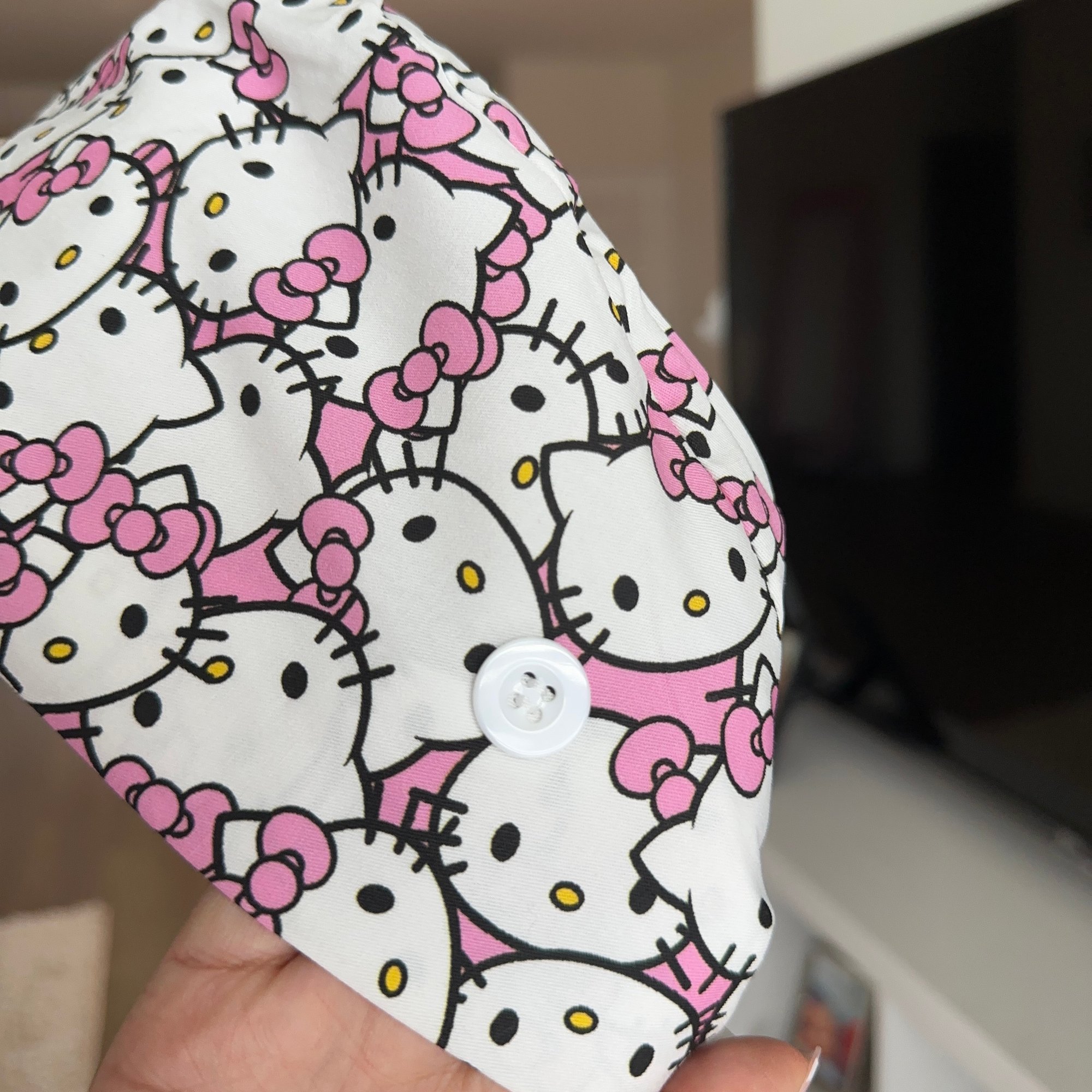 Hello Kitty Scrub Cap with WHITE satin lining. Adjustable to fit all head sizes.